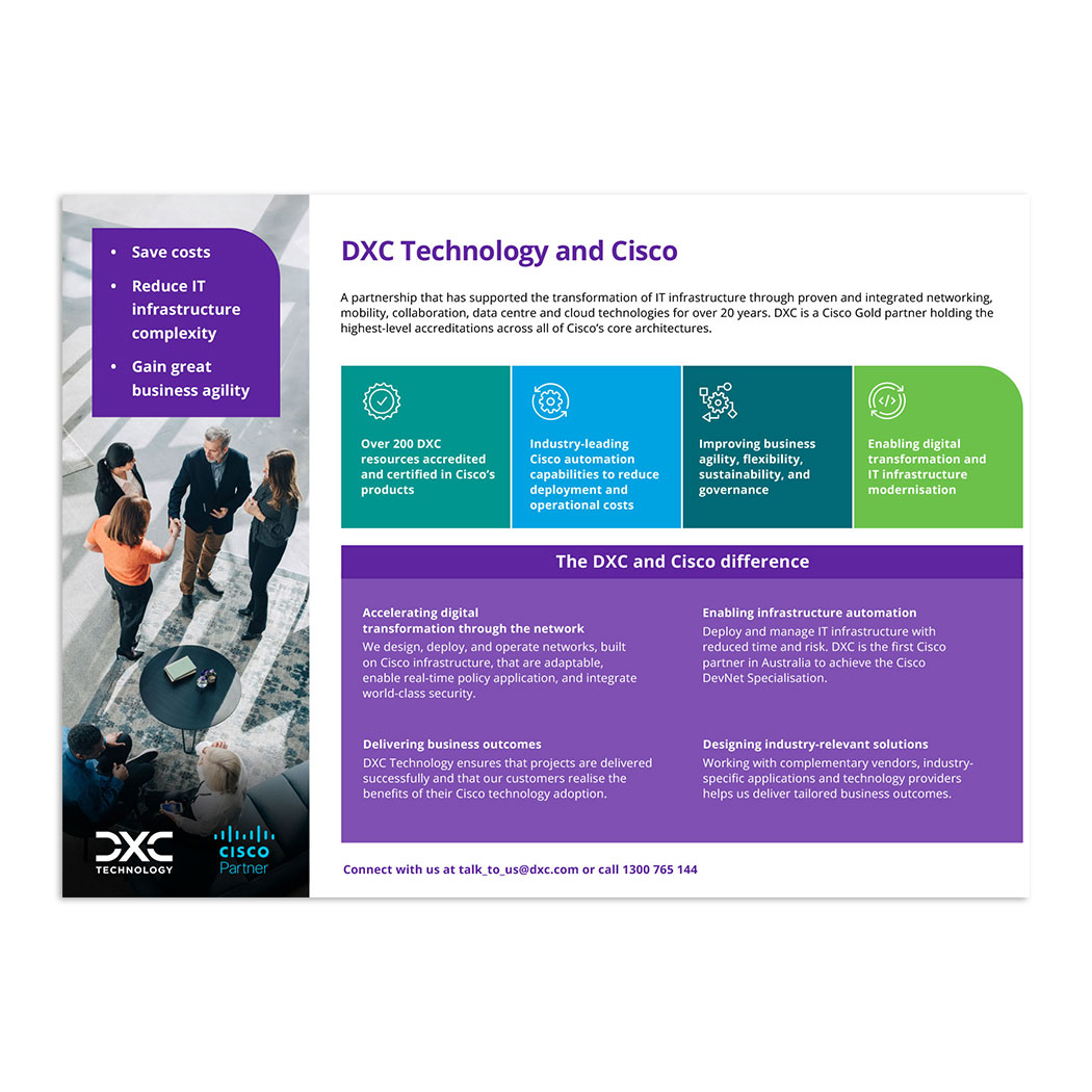 DXC Technology and Cisco With over 200 DXC resources accredited and certified in Cisco’s products, learn how you can save costs, reduce IT infrastructure complexity and gain greater business agility with the DXC and Cisco difference. Download brochure
