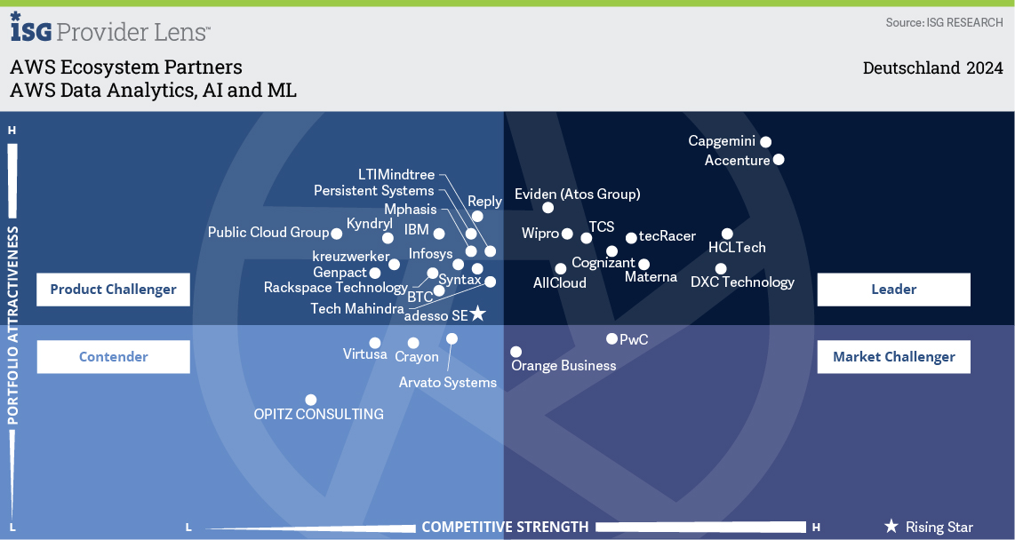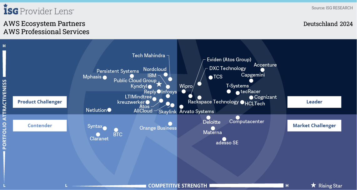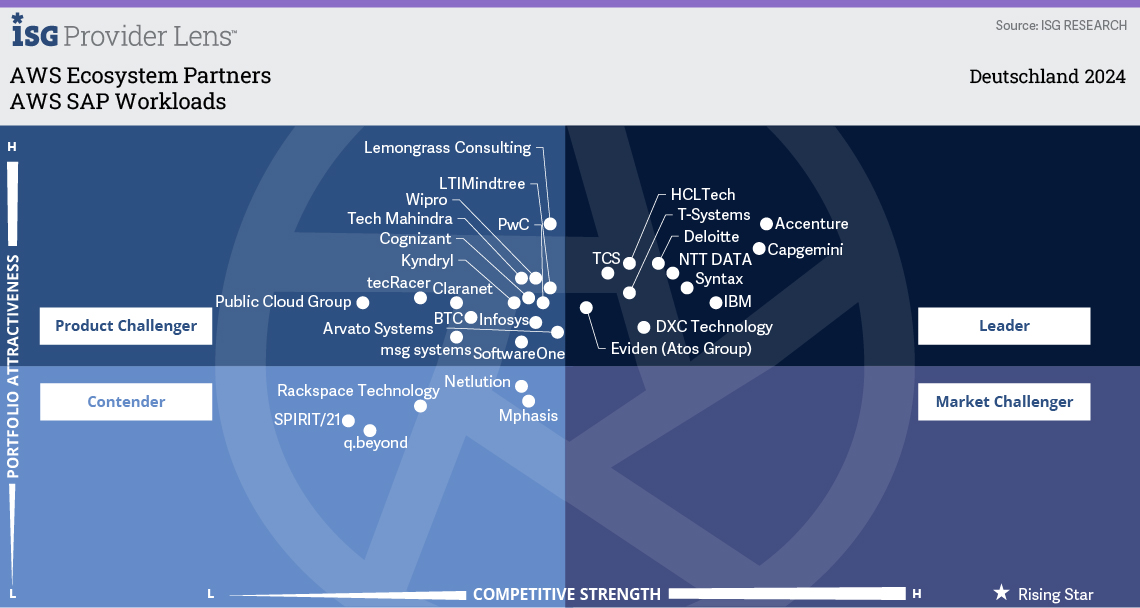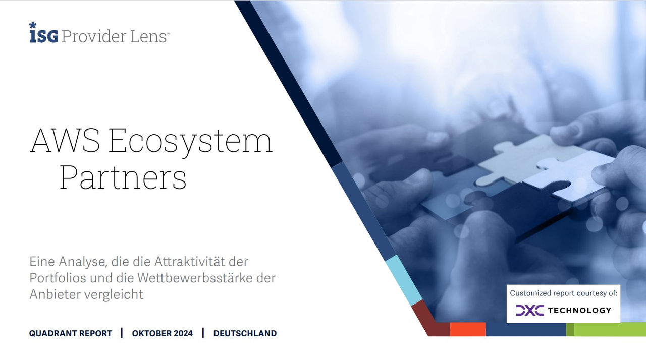 In diesem ISG Provider Lens™-Forschungsbericht fasst ISG die globalen und regionalen Trends der AWS-Ökosystempartner zusammen und beleuchtet ihre Fähigkeit, das AWS-Cloud-Ökosystem aus globaler und regionaler Sicht zu unterstützen. Die Anbieterposition spiegelt die Qualifikation der IT-Anbieter für ein bestimmtes Marktsegment (Quadrant) wider. Der Bericht platziert DXC Technology (Deutschland) als Leader in vier Fokus-Quadranten: AWS Professional Services; AWS Managed Services; AWS Data Analytics, AI und ML; und AWS SAP Workloads.