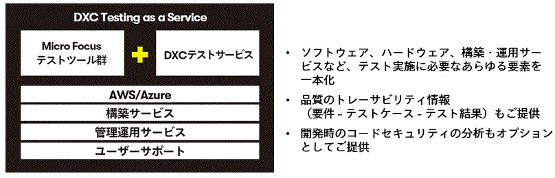 DXC Testing as a Serviceは、アプリケーション開発におけるテストの自動化とその管理をクラウド上で実行できるサービスだ。ソフトウェアはもちろん、環境構築や運用サービスなど、 テスト実施に必要なあらゆる要素を一本化して提供している。