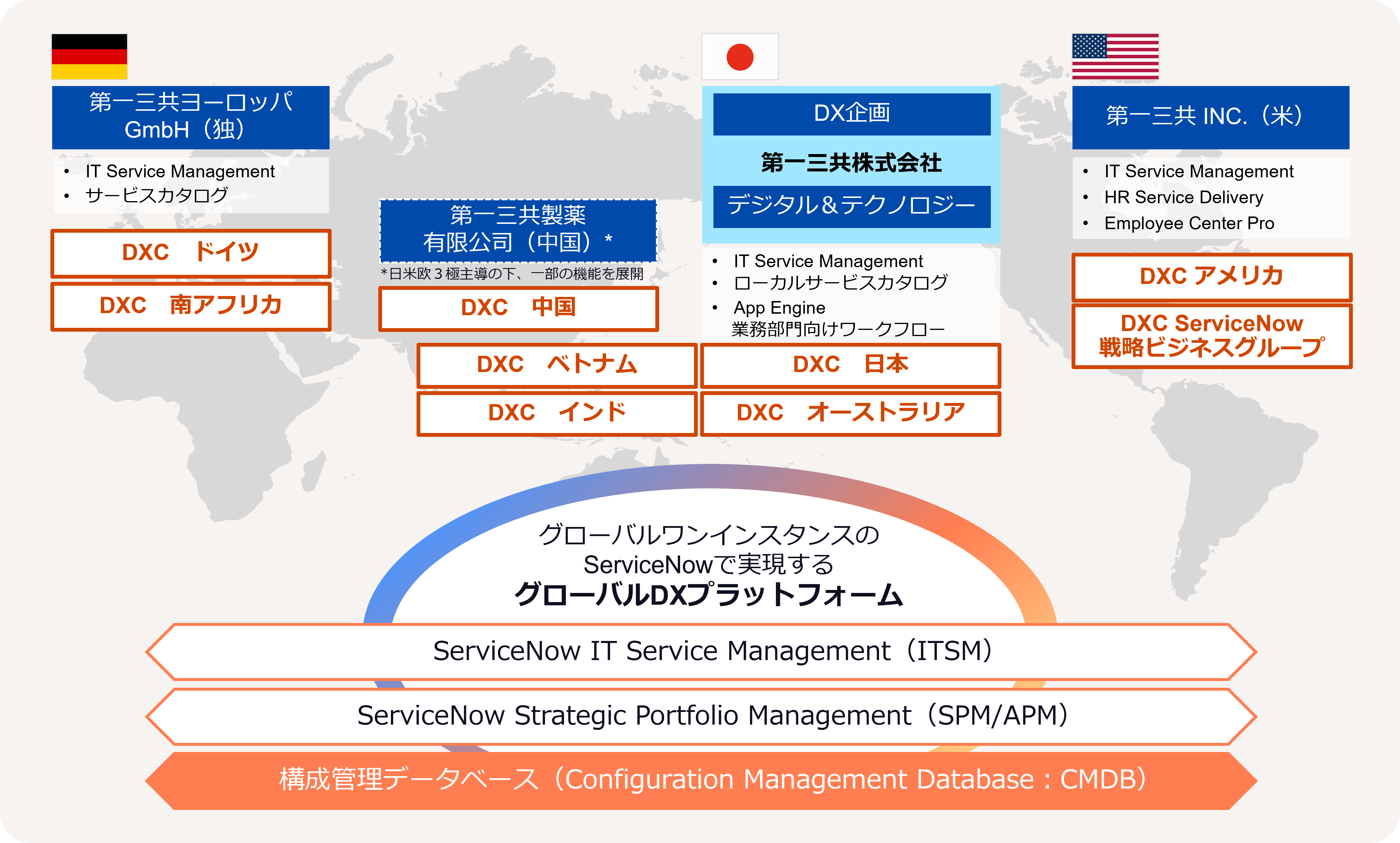 第一三共が、2030年ビジョン『サステナブルな社会の発展に貢献する先進的グローバルヘルスケアカンパニー』の実現に向けて、成長戦略を加速させている。医療用医薬品の世界規模での開発競争が激しさを増す中、よりスピード感のある意思決定と事業推進を実現するために「データと先進デジタル技術」を最大限に活用した変革が進む。DXCテクノロジーは、第一三共のデジタル変革を主導する戦略組織のパートナーとして、ServiceNowによるグローバルDXプラットフォームの整備と活用を包括的にサポートしている。 ベネフィット ServiceNow活用の高度化を通じて、グローバルでITサービスの品質向上とITコスト最適化を実現 グローバルDXとして3極(日米欧)が連携して推進体制を強化 Operational Excellenceプログラムの取り組みを通じて、データ駆動型の意思決定、デジタル戦略の更なる推進を可能に 先進的グローバルヘルスケアカンパニーへの変革に挑む 医療用医薬品で国内トップシェアを誇る第一三共が、「がんに強みを持つ先進的グローバル創薬企業」としての存在感を急速に高めている。抗体薬物複合体(ADC)に代表されるがん治療薬が、同社のグローバルな成長を加速させる原動力である。その成長をデータとデジタル技術で支えるDX企画部のミッションについて、同部部長として第一三共のDX戦略をリードする上杉康夫氏は次のように話す。 第一三共株式会社 DX 企画部長 上杉 康夫 氏 「第一三共は、2030年ビジョンとして『サステナブルな社会の発展に貢献する先進的グローバルヘルスケアカンパニー』を目指すと宣言しました。DX企画部は、その実現を支える戦略組織として社内外のスペシャリストを集結して2020年に新設されたチームです。私たちの重要なミッションのひとつに、グローバル共通のDXプラットフォームの整備があります。データとデジタル技術をフルに活用し、スピード感のある意思決定と事業推進を支え、グローバルでの成長戦略を加速させていきます」 データ駆動型経営の実現、先進デジタル技術による業務変革、グローバルマネジメント体制の強化――先進的グローバルヘルスケアカンパニーを指向する第一三共のDXへのチャレンジは広範に及ぶ。 「チーフデジタルトランスフォーメーションオフィサー(CDXO)のもと、2020年度に日米欧のDXに関連するデータおよびデジタル活用に関する機能が集約されるとともに、2023年度にはHealthcare as a Serviceを推進する機能を新設し、グローバルDXとして一丸となって変革を進めています。DX企画部は、戦略企画とその実行管理を担うとともに、様々な施策を通じて第一三共のグローバルでのデータとデジタル技術の活用を支えています」(上杉氏) DXCのServiceNow関連サービスについて見る ServiceNow活用の高度化をいかに実現するか 医療用医薬品の開発競争が激しさを増す中、第一三共はグローバル研究開発体制の強化に力を注いでいる。研究開発を支える業務プロセスはグローバル横断的な形にシフトし、それを支えるアプリケーションもいち早くグローバル化が進んできた。DX企画部 DX企画グループ 主幹の山光由佳氏は次のように話す。 第一三共株式会社 DX 企画部 DX 企画グループ 主幹 山光 由佳 氏 「グローバルアプリケーションのサービス品質を向上させるために、2016年にServiceNow IT Service Management (以下ITSM)をグローバルワンインスタンスで導入し活用してきました。ITサービス管理やヘルプデスクにかかる業務プロセスとツールを標準化するための、共通の運用基盤を整備することが当初の目的でした。現在では、リージョン固有の環境を含めおよそ450のアプリケーションやサービスを運用し、約1,200名のITスタッフがServiceNow ITSMを活用しています」 ServiceNow ITSMがグローバル共通基盤として定着し、これを利用する国々や管理対象が増大していく過程では、運用やメンテナンスに関わる社員の業務負荷も高まっていった。 「より大きな役割を担うようになったServiceNow ITSMをより良い形で運用し、グローバルで活用の成果を高めていくための新しい支援チームが必要でした。そこで私たちは、2020年にServiceNow ITSMのグローバルメンテナンスパートナーとしてDXCテクノロジーを選定しました」(山光氏) DXCは2023 HFS HorizonsレポートでServiceNow関連サービスのマーケットリーダーに選出されました ServiceNow Global Elite Partnerならではの支援体制 DXCテクノロジーは、世界に7社(2023年12月時点)しかないServiceNow Global Elite Partnerの1社であり、アドバイザリー、システム開発、マネージドサービスを通じてグローバルで1,000社以上の顧客企業にServiceNowのソリューションを提供している。独自のServiceNow運用モデル「グローバル AMS」には、インシデント、変更、改善など、ベストプラクティスに基づく標準プロセスが体系化されている。ServiceNow Practice Directorとしてプロジェクトに参画するDXCテクノロジー・ジャパンの立花俊樹氏は次のように話す。 「私たちの提案の中核は、第一三共様(日本・本社)をDXCテク