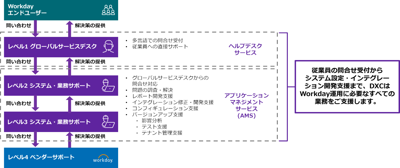 保守運用 (アプリケーション マネジメントサービス) DXCは常にお客様の業務が潤滑に遂行できることを第一優先として保守運用のサービスを提供します。保守運用には年に二度実施されるWorkdayのリリースアップグレードに対する支援も含まれます。 詳しく見る