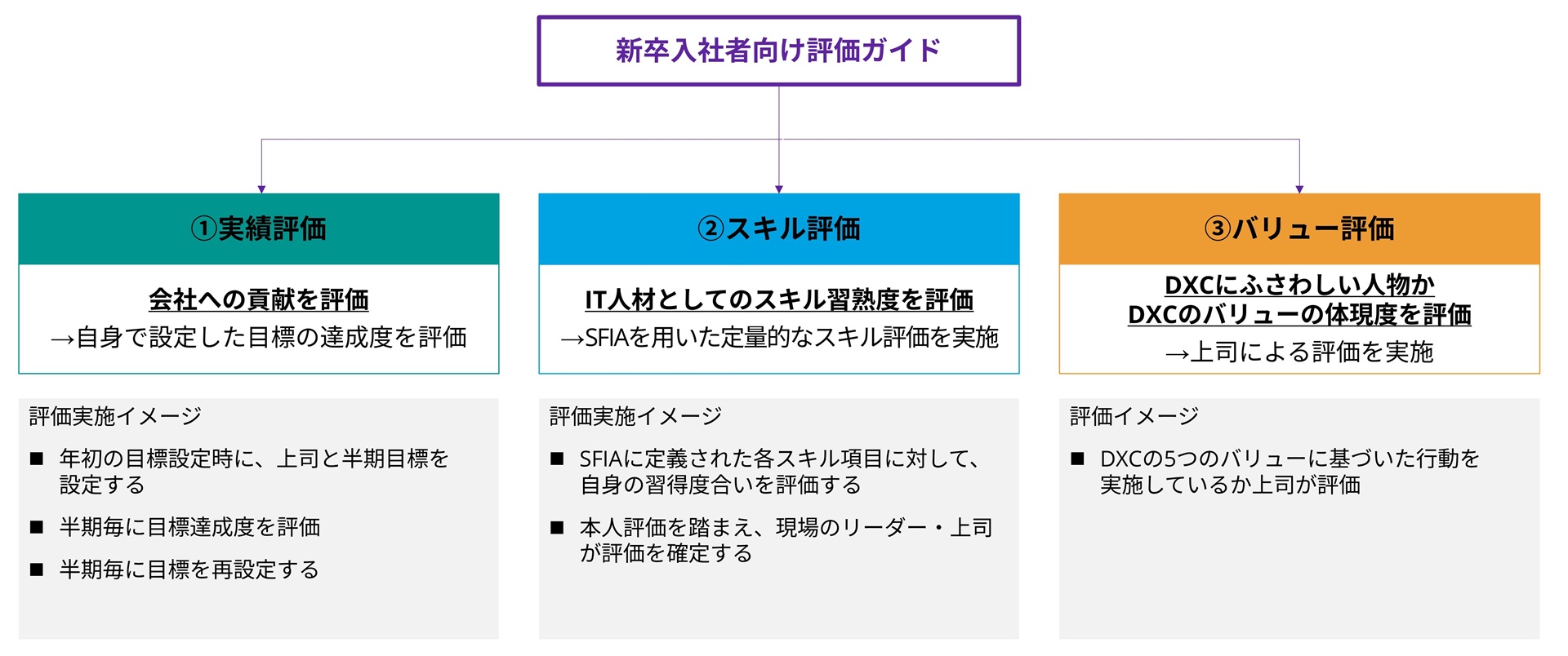 DXC テクノロジー・ジャパンでは、新卒入社社員を対象に、入社1年目から5年目終了時まで、もしくは入社時のジョブレベルから一定昇格するまでの期間、自身のキャリア開発・成長やモチベーションの向上を目的とした日本独自の評価ガイドを導入しています。
