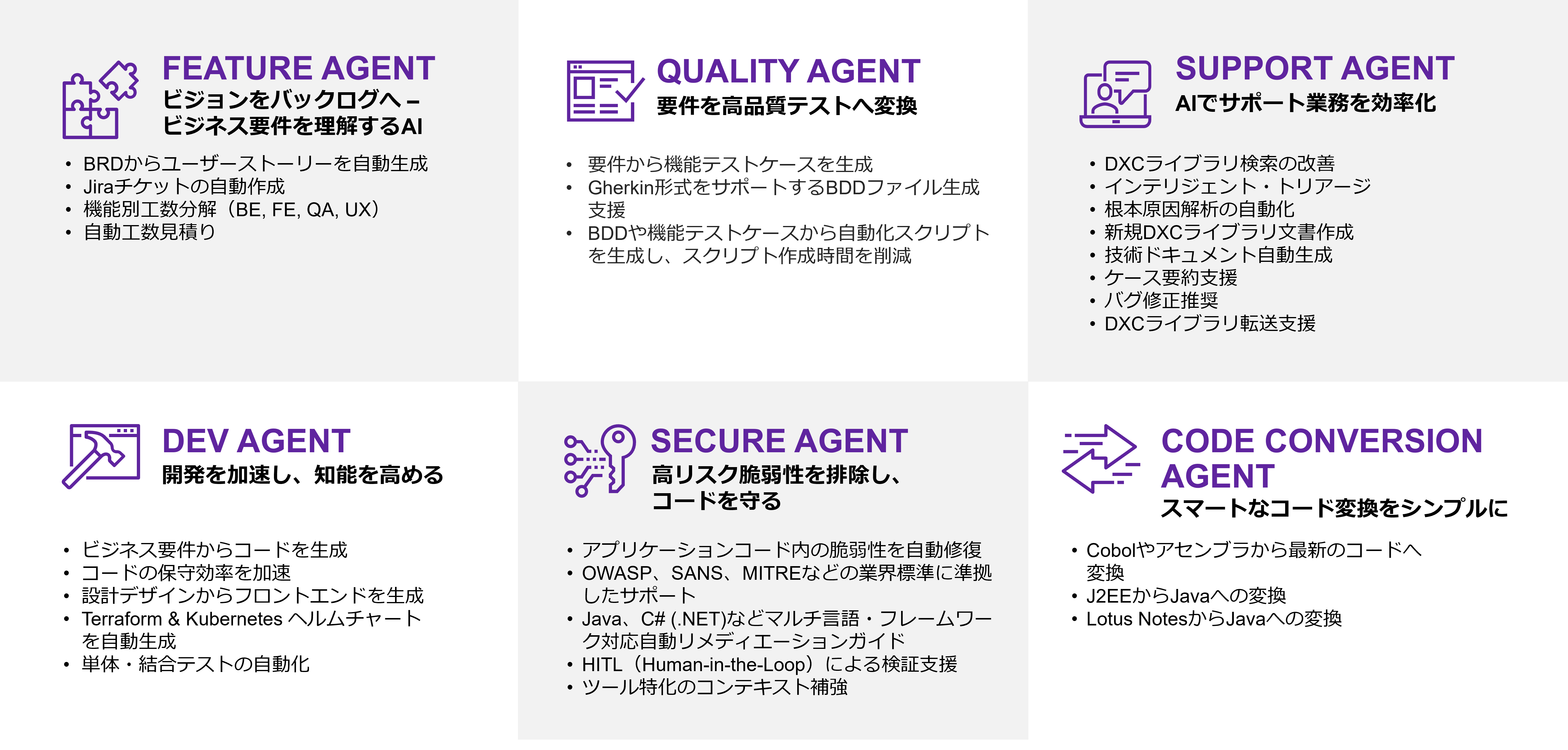 ビジネス要求を迅速に実装へとつなげ、変化に強い開発基盤を実現します。DXCのエージェンティックAIは、次世代の開発スタイルを支える中核的な存在です。