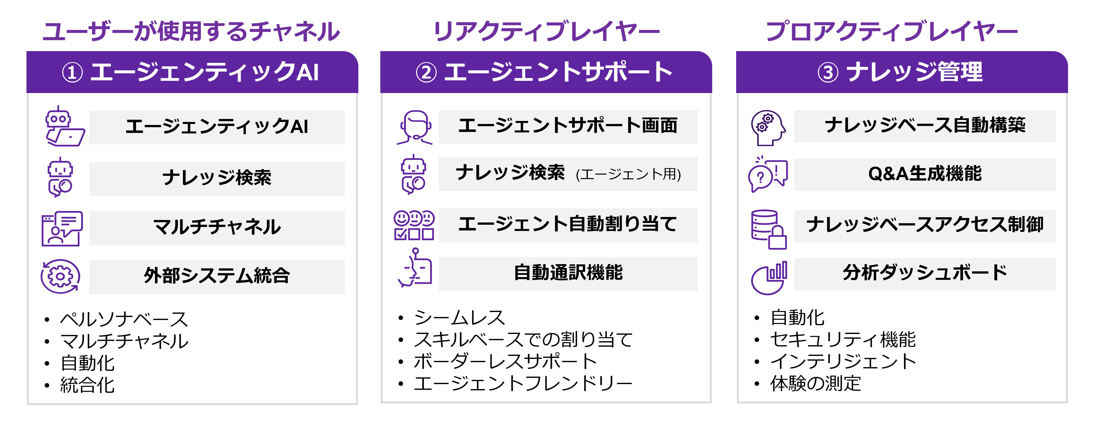 エージェンティックAIによるマルチチャネル対応や外部システム統合で利便性を高め、ユーザーの自己解決を促進。同時に、エージェントには自動割り当てや翻訳機能を提供し、スムーズな対応を可能にします。
