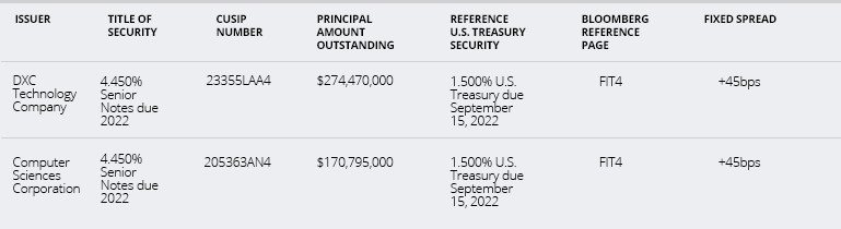 In addition, substantially concurrently with the commencement of the tender offers, the Company and CSC expect to issue notices of full redemption to the holders of the DXC Notes and the CSC Notes, respectively, to redeem all of the DXC Notes and the CSC Notes, specifying April 15, 2021 as the redemption date (the “2022 Notes Redemption”). This will result in the retirement of all DXC Notes and the CSC Notes that remain outstanding after consummation of the tender offers. In addition, substantially concurrently with the commencement of the tender offers, the Company expects to issue a notice of full redemption to the holders of its 4.00% Senior Notes due 2023 (the “2023 Notes”) to redeem all of the 2023 Notes (the “2023 Notes Redemption” and, together with the 2022 Notes Redemption, the “Redemptions”), specifying March 26, 2021 as the redemption date. The 2023 Notes are not subject to the tender offers. The Company will use the funds required to consummate the Redemptions from cash on hand. Neither the tender offers nor the Redemptions are conditioned on the completion of the other. The tender offers do not constitute a notice of redemption or an obligation to issue a notice of redemption.