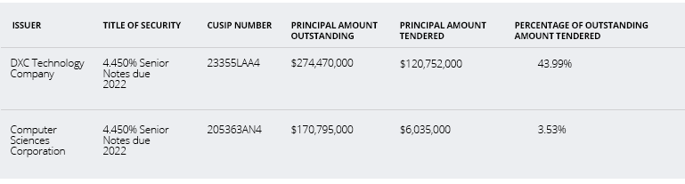 The remaining DXC Notes and CSC Notes, which in aggregate total $153,718,000 and $164,760,000 in principal amount, respectively, not otherwise accepted for tender, will be subject to redemption and will be retired on April 15, 2021, in accordance with respect to each of the indentures applicable thereof. This includes the CSC Notes that remain subject to the guaranteed delivery procedures described in the offer to purchase relating to the tender offers unless otherwise accepted for tender pursuant to such guaranteed delivery procedures.