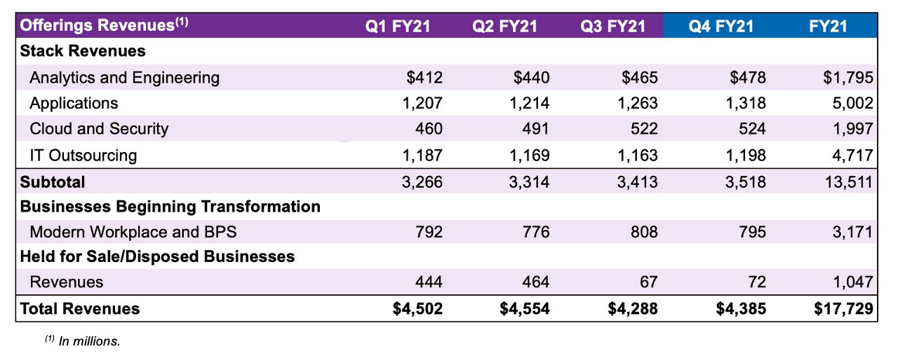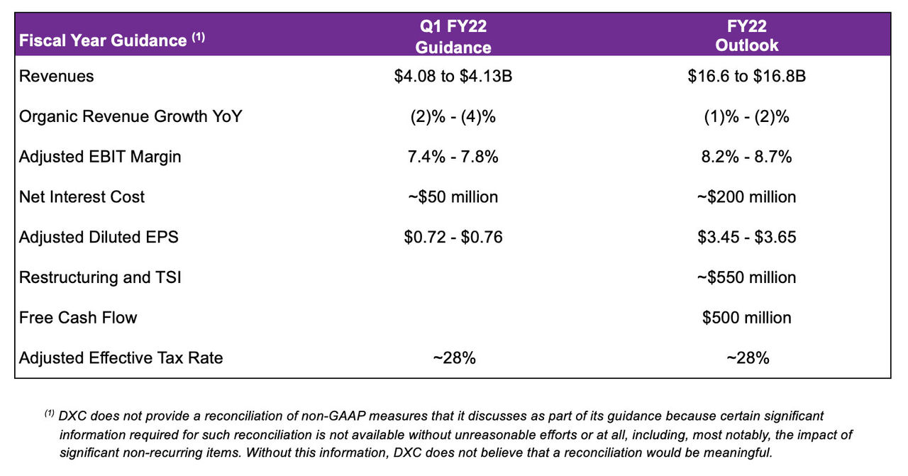 “I am pleased to report a solid fourth quarter as the leadership team continues to execute on our transformation journey. Our results clearly indicate that we are winning in the marketplace, which in turn is driving improved sequential revenue and adjusted EBIT margin performance,” said Mike Salvino, DXC president and chief executive officer. “I would like to thank the entire DXC team for their continued strong execution. Our FY22 and longer-term expectations reflect continuing solid business momentum and our confidence that we are building a people and customer focused organization that will compete and win in the IT services industry.” Mr. Salvino continued, “As the world is witnessing the ongoing impact of COVID-19, our focus continues to be on our people, particularly in the more severely impacted areas including India and the Philippines. The dedication and perseverance on display by our team is a source of the great pride I have as our people continue to take care of themselves, each other, their families, and deliver for our customers.”