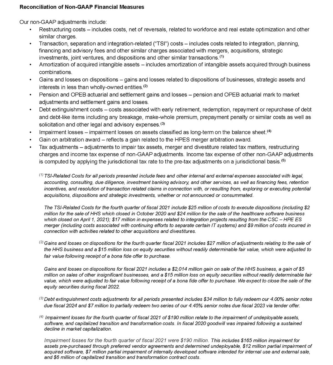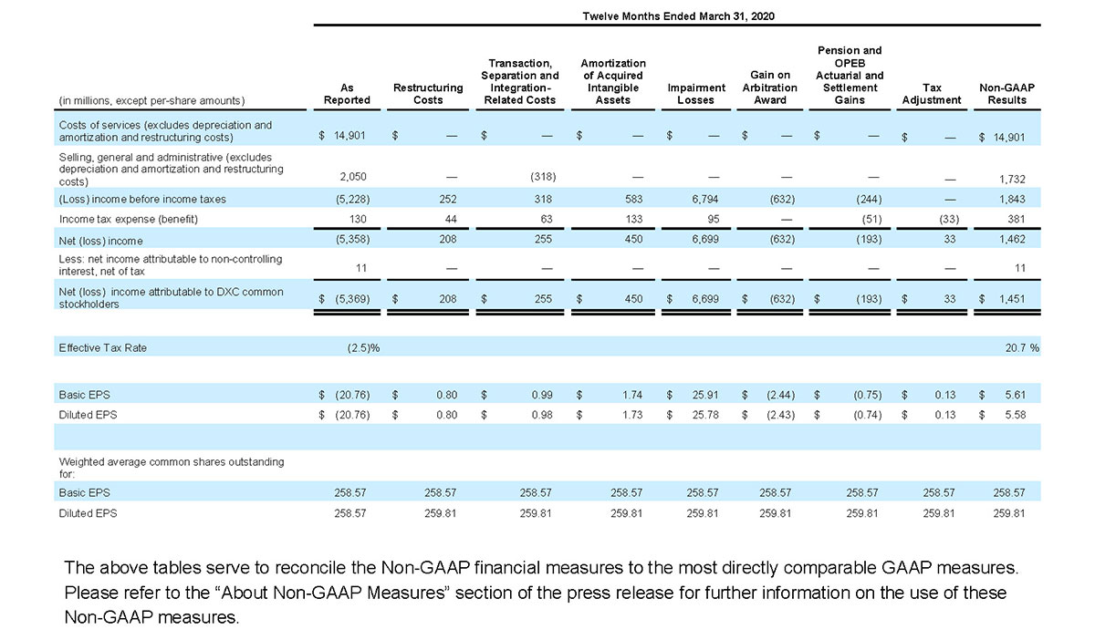 One category of expenses excluded from adjusted EBIT, non-GAAP income from continuing operations before tax, non-GAAP net income and non-GAAP EPS, incremental amortization of intangible assets acquired through business combinations, may result in a significant difference in period over period amortization expense on a GAAP basis. We exclude amortization of certain acquired intangible assets as these non-cash amounts are inconsistent in amount and frequency and are significantly impacted by the timing and/or size of acquisitions. Although DXC management excludes amortization of acquired intangible assets primarily customer-related intangible assets, from its non-GAAP expenses, we believe that it is important for investors to understand that such intangible assets were recorded as part of purchase accounting and support revenue generation. Any future transactions may result in a change to the acquired intangible asset balances and associated amortization expense.