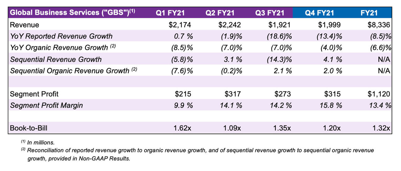 GBS segment revenue was $1.999 billion in the fourth quarter of fiscal year 2021, down 13.4% compared to prior year, and down 4.0% on an organic basis. On a sequential basis, GBS revenues increased 4.1% and on an organic basis, increased 2.0%, driven by growth in Analytics and Engineering, Applications and Business Process Solutions ("BPS"). GBS Segment profit was $315 million and segment profit margin was 15.8%, up 160 bps as compared to the third quarter of fiscal year 2021. GBS bookings for the quarter were $2.4 billion for a book-to-bill of 1.20x.