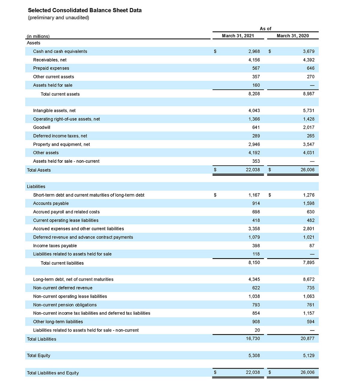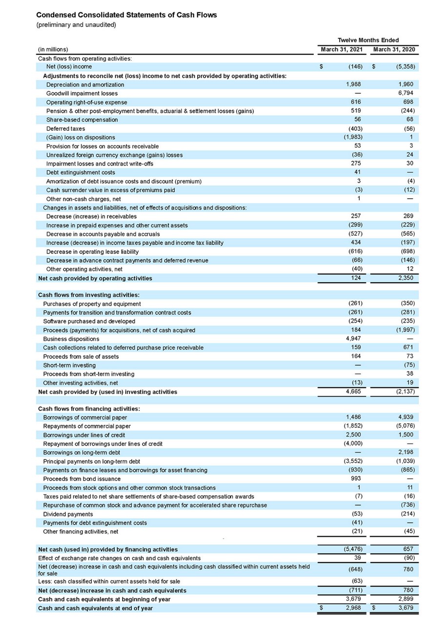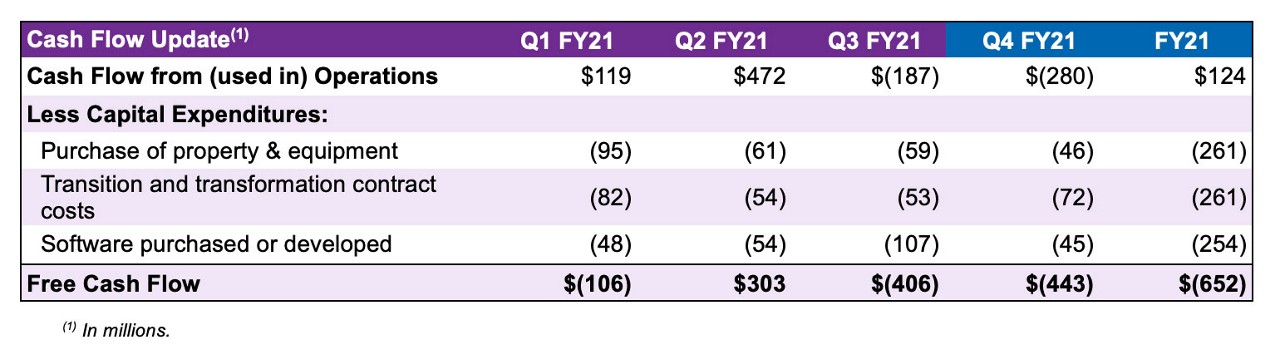 Cash flow used in operations was $280 million in the fourth quarter of fiscal year 2021, and capital expenditures were $163 million, resulting in free cash flow (cash flow used in operations less capital expenditures) of $(443) million. Cash flow in the fourth quarter was impacted by the payment of taxes related to disposed businesses of $531 million. In fiscal year 2021, cash flow was reduced by the $531 million payment of taxes for the disposed businesses, $500 million normalization of payments to our partners and vendors, and $323 million related to the unwinding of the securitization of receivables and purchase of software license in connection with the sale of the U.S. State & Local Health and Human Services business. The aforementioned payments in fiscal year 2021 are not expected to reoccur.