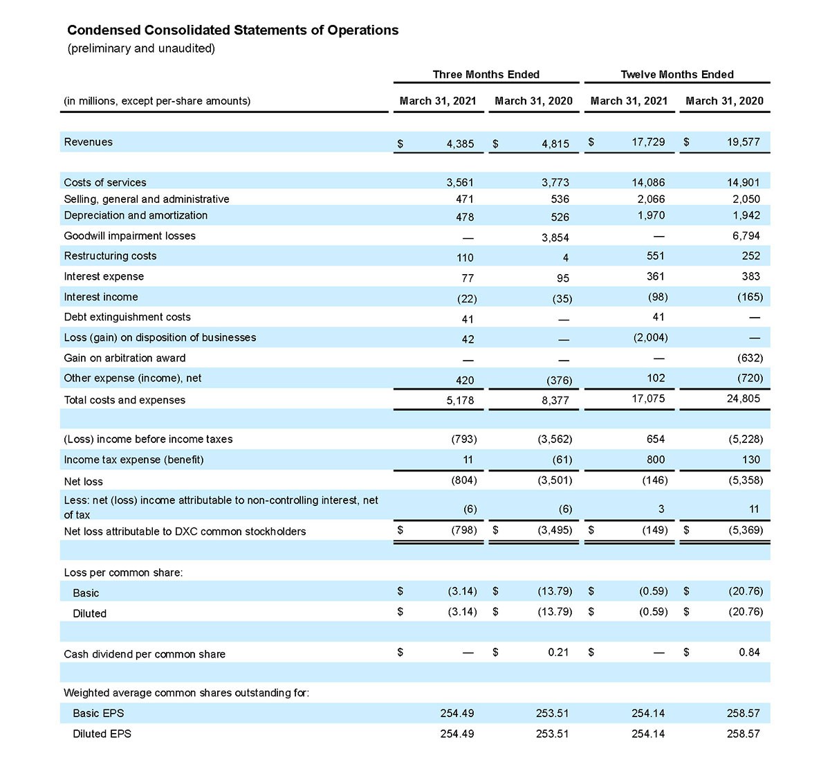 TYSONS, Va., May 26, 2021 – DXC Technology (NYSE: DXC) today reported results for the fourth quarter and fiscal year 2021.