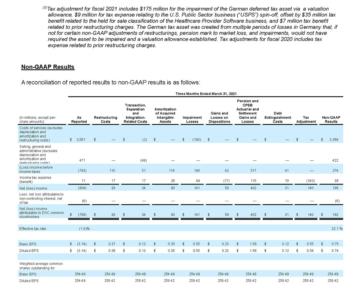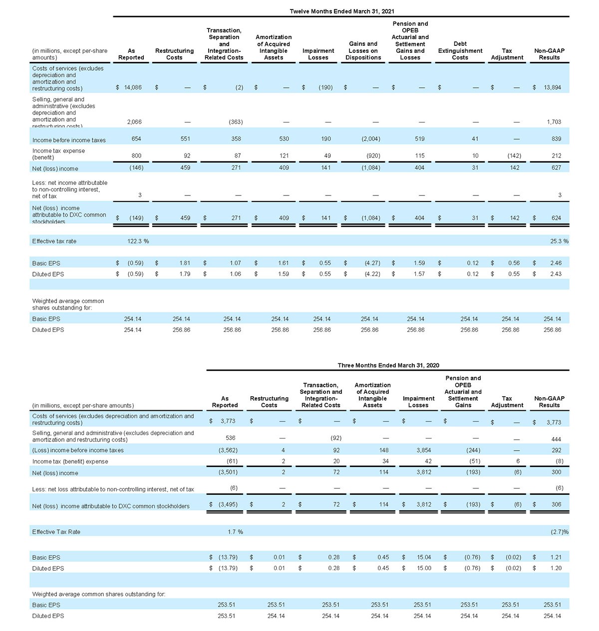 All statements in this press release that do not directly and exclusively relate to historical facts constitute “forward-looking statements.” These statements represent current expectations and beliefs, and no assurance can be given that the results described in such statements will be achieved. Such statements are subject to numerous assumptions, risks, uncertainties and other factors that could cause actual results to differ materially from those described in such statements, many of which are outside of our control including the uncertainty of the magnitude, duration, geographic reach of the COVID-19 crisis, its impact on the global economy, and the impact of current and potential travel restrictions, stay-at-home orders, and economic restrictions implemented to address the crisis; the effects of macroeconomic and geopolitical trends and events; our inability to succeed in our strategic objectives; our inability to succeed in our strategic transactions; the risk of liability or damage to our reputation resulting from security breaches, cyber-attacks or disclosure of sensitive data or failure to comply with data protection laws and regulations, including the ransomware attack experienced by our subsidiary, Xchanging; the development and transition of new products and services and the enhancement of existing products and services to meet customer needs, respond to emerging technological trends and maintain and grow our customer relationships over time; the risks associated with our international operations; our credit rating and ability to manage working capital, refinance and raise additional capital for future needs; the competitive pressures faced by our business; our inability to accurately estimate the cost of services, and the completion timeline, of contracts; execution risks by us and our suppliers, customers, and partners; our inability to retain and hire key personnel and maintain relationships with key partners; our inability to comply with governmental regulations or the adoption of new laws or regulations; our inability to achieve the expected benefits of our restructuring plans; inadvertent infringement of third-party intellectual property rights or our inability to protect our own intellectual property assets; our inability to remediate any material weakness and maintain effective internal control over financial reporting; potential losses due to asset impairment charges; our inability to pay dividends or repurchase shares of our common stock in accordance with our announced intent; pending investigations, claims and disputes and any adverse impact on our profitability and liquidity; disruptions in the credit markets, including disruptions that reduce our customers' access to credit and increase the costs to our customers of obtaining credit; our failure to bid on projects effectively; financial difficulties of our customers and our inability to collect receivables; our inability to maintain and grow our customer relationships over time and to comply with customer contracts or government contracting regulations or requirements; changes in tax laws and any adverse impact on our effective tax rate; and the other factors described in the section titled “Risk Factors” in DXC's Annual Report on Form 10-K for the year ended March 31, 2020, its Quarterly Reports on Form 10-Q for the quarters ended June 30, 2020, September 30, 2020, December 31, 2020 and any updating information in subsequent SEC filings, including DXC's upcoming Form 10-K for the fiscal year ended March 31, 2021. No assurance can be given that any goal or plan set forth in any forward-looking statement can or will be achieved, and readers are cautioned not to place undue reliance on such statements which speak only as of the date they are made. We do not undertake any obligation to update or release any revisions to any forward-looking statement or to report any events or circumstances after the date of this press release or to reflect the occurrence of unanticipated events except as required by law.