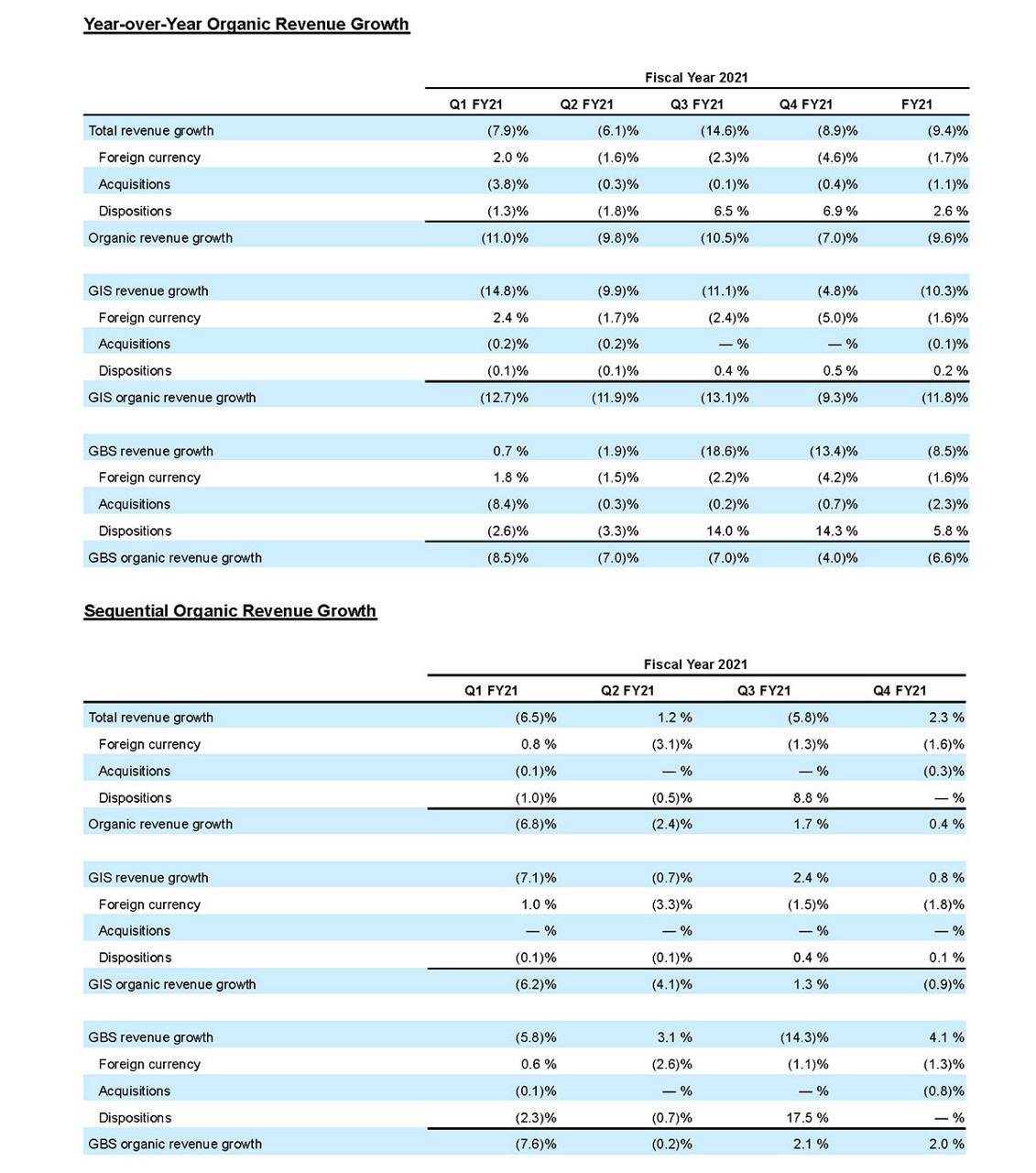 Revenue was $4.385 billion, down 8.9% as compared to prior year, and down 7.0% on an organic basis. Fourth quarter revenues exceeded the Company’s previous revenue guidance range. Revenues increased 2.3% as compared to the third quarter of fiscal year 2021 and were up 0.4% on a sequential organic basis. This represents the third sequential quarter of organic revenue stabilization for DXC, and management anticipates this trend to continue into fiscal year 2022.