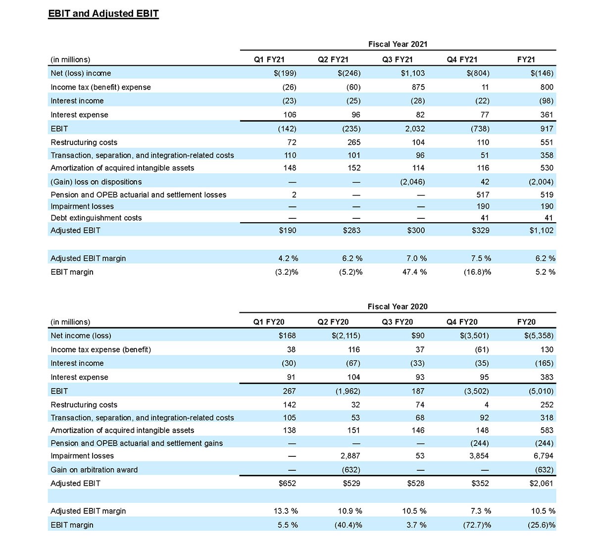 Net loss and EBIT included a $517 million pension and other post-employment benefits mark-to-market actuarial and settlement loss, asset impairment charges of $190 million, amortization of intangibles of $116 million, restructuring charges of $110 million, transaction, separation and integration cost of $51 million, loss on disposition of $42 million and a $41 million debt extinguishment charge resulting in EBIT margin of (16.8)% in the fourth quarter of fiscal 2021. Excluding these items, adjusted EBIT margin was 7.5% in the fourth quarter, an improvement of 50 basis points from the third quarter of fiscal year 2021. Fourth quarter adjusted EBIT margin came in above our guidance range.