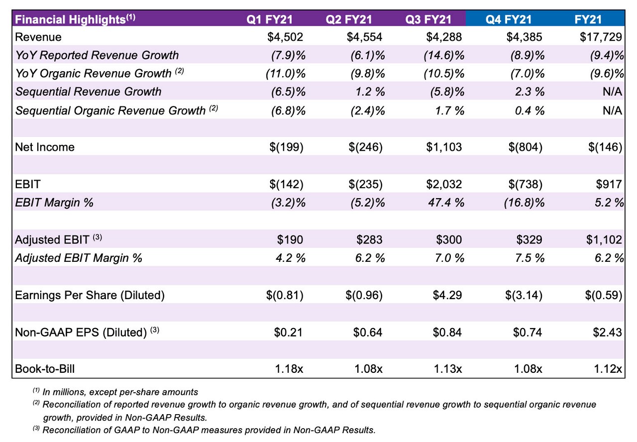 • Bookings of $4.7 billion and book-to-bill ratio of 1.08x in Q4 FY21