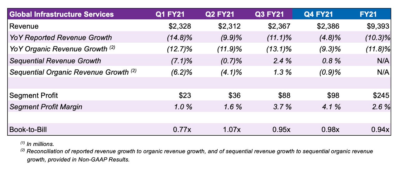 GIS Segment revenue was $2.386 billion in the fourth quarter of 2021, down 4.8% compared to prior year, and down 9.3% on an organic basis. On a sequential basis, GIS revenues increased 0.8% and decreased 0.9% on an organic basis, driven by low-single digit revenue growth in IT Outsourcing, offset by declines in Cloud and Security and Modern Workplace. GIS segment profit was $98 million with a segment profit margin of 4.1%, a 40 basis points segment margin expansion as compared to third quarter of fiscal year 2021. GIS bookings were $2.3 billion in the quarter for a book-to-bill of 0.98x.