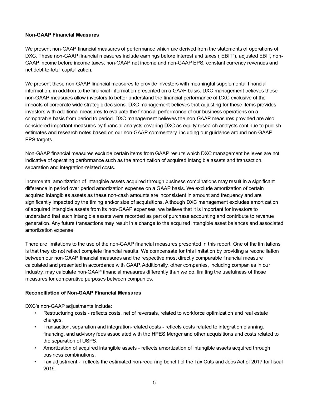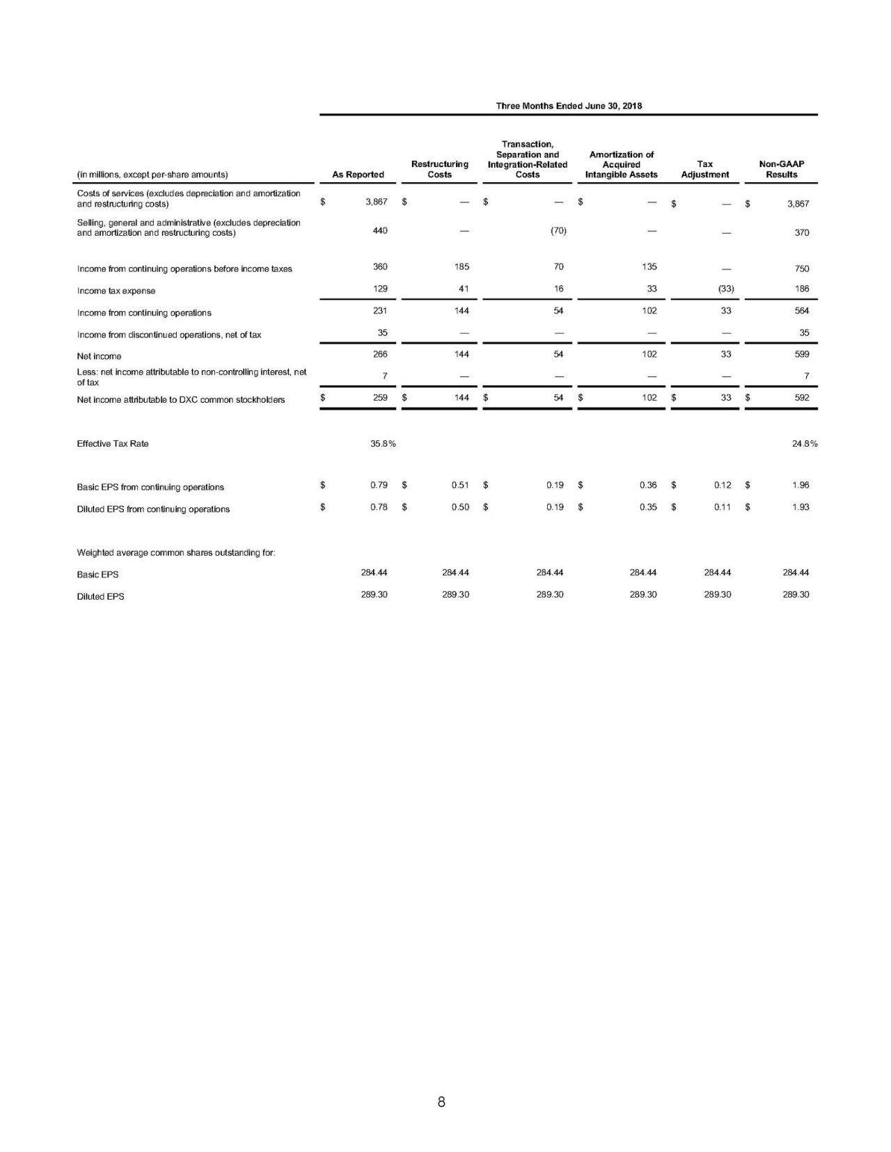 All statements in this press release that do not directly and exclusively relate to historical facts constitute “forward-looking statements.” These statements represent current expectations and beliefs, and no assurance can be given that the results described in such statements will be achieved. Such statements are subject to numerous assumptions, risks, uncertainties and other factors that could cause actual results to differ materially from those described in such statements, many of which are outside of our control. For a written description of these factors, see the section titled “Risk Factors” in DXC's Annual Report on Form 10-K for the fiscal year ended March 31, 2019, and any updating information in subsequent SEC filings including DXC's upcoming Quarterly Report on Form 10-Q for the quarterly period ended June 30, 2019. No assurance can be given that any goal or plan set forth in any forward-looking statement can or will be achieved, and readers are cautioned not to place undue reliance on such statements which speak only as of the date they are made. We do not undertake any obligation to update or release any revisions to any forward-looking statement or to report any events or circumstances after the date of this press release or to reflect the occurrence of unanticipated events except as required by law.