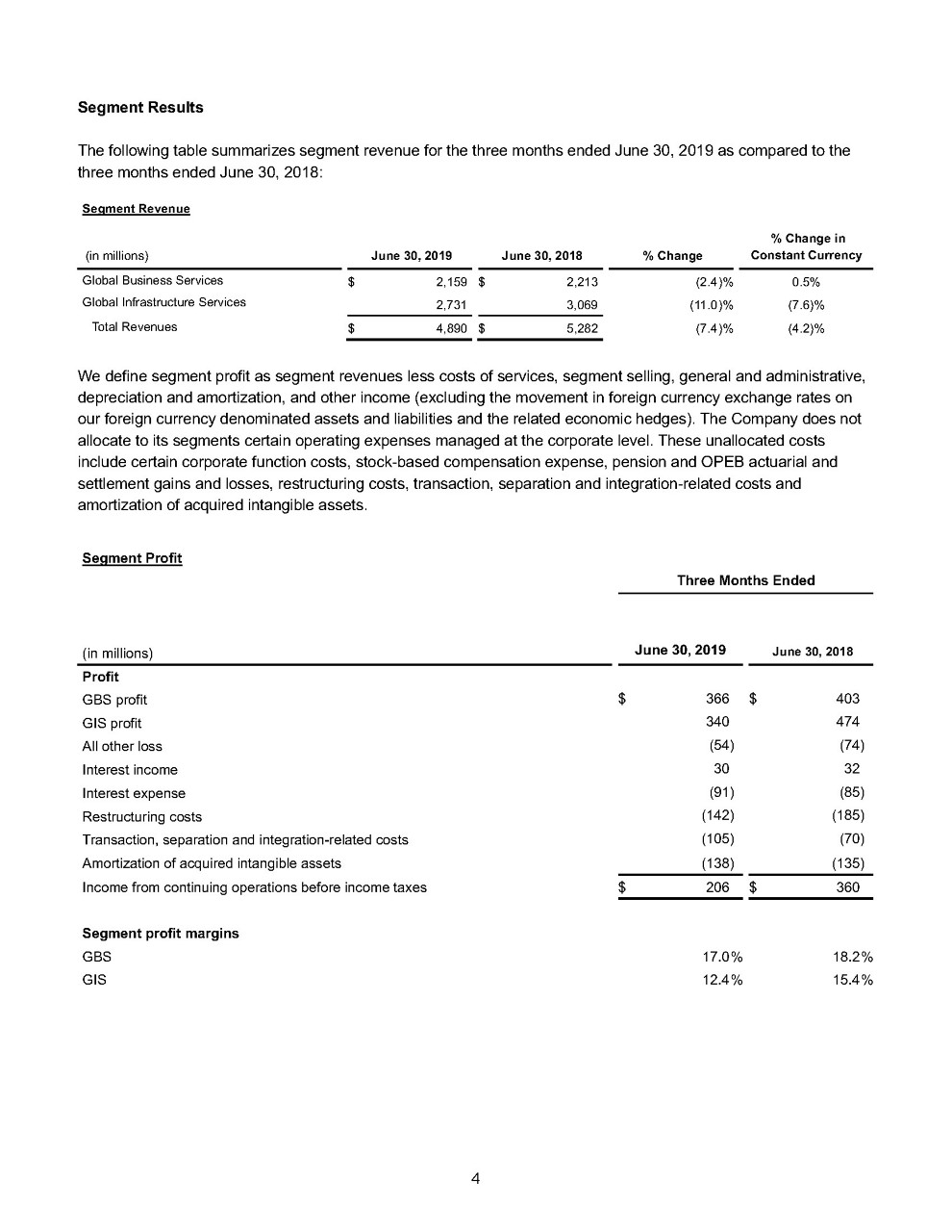 GIS revenue was $2,731 million in the quarter compared with $3,069 million for the prior year. GIS revenues decreased 11.0% year-over-year, including an unfavorable foreign currency exchange rate impact of 3.4%. GIS revenues decreased 7.6% year-over-year at constant currency as a result of the acceleration of client savings on several large contracts as well as continued decline in our IT outsourcing services business as clients shift to cloud environments. GIS profit margin in the quarter was 12.4%, down from 15.4% in the prior year, reflecting investments in the business and less impact from cost improvement actions. New business awards for GIS were $1.8 billion in the first quarter.