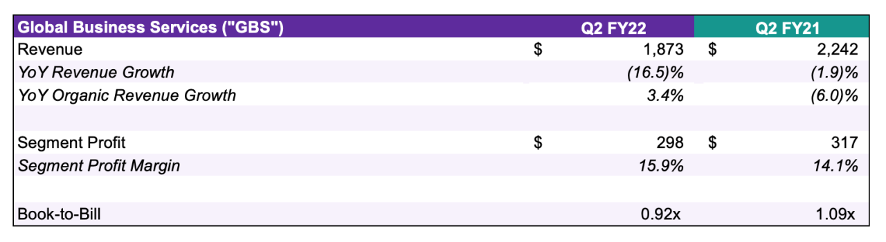 GBS segment revenue was $1.873 billion in the second quarter of fiscal year 2022, down 16.5% compared to prior year, but up 3.4% on an organic basis. GBS segment profit was $298 million and segment profit margin was 15.9%, up 180 bps as compared to the second quarter of fiscal year 2021. GBS bookings for the quarter were $1.72 billion for a book-to-bill of 0.92x.