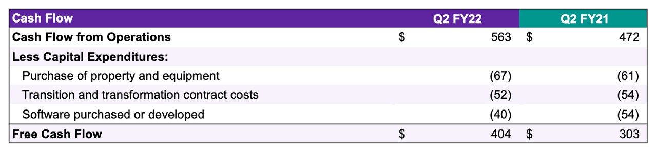 Cash flow from operations was $563 million in the second quarter of fiscal year 2022, and capital expenditures were $159 million. Free cash flow (cash flow from operations, less capital expenditures) was $404 million in the second quarter of FY22, as compared to $303 million in the second quarter of FY21. Second quarter FY22 cash flow included a tax payment of $160 million related to divestitures and cash outflows related to the refinancing of the Company’s high coupon debt.