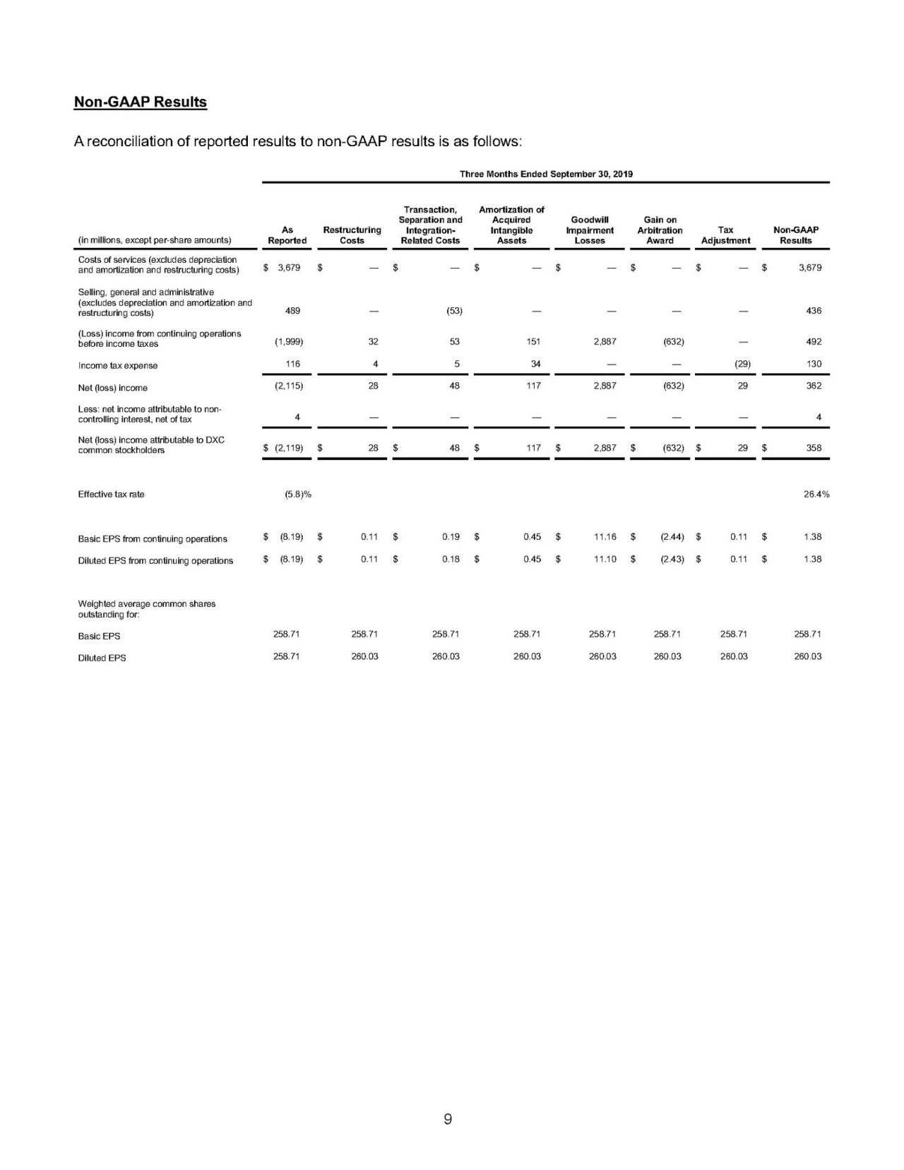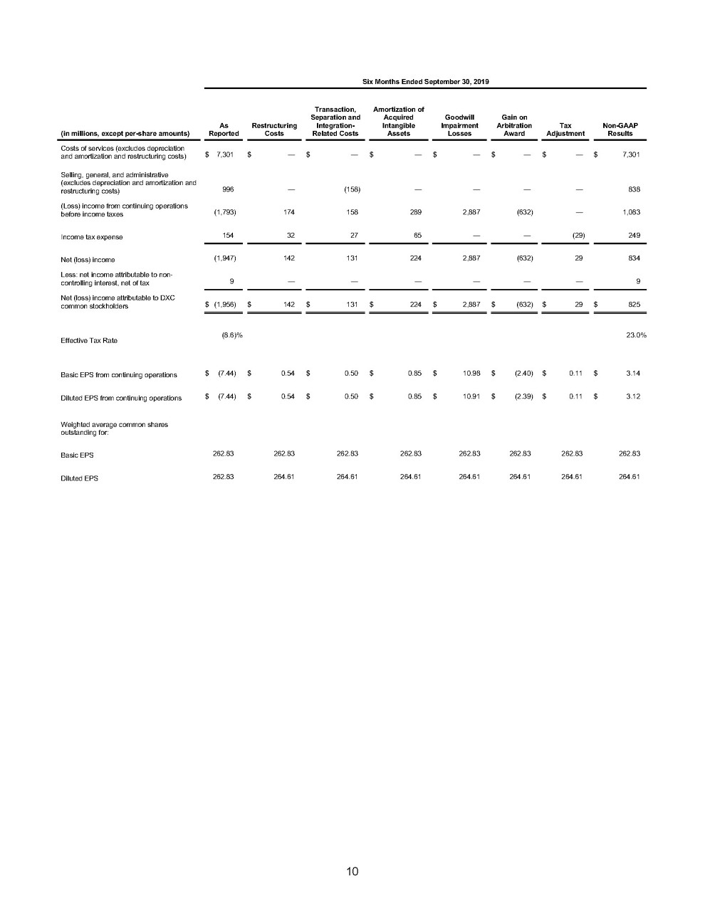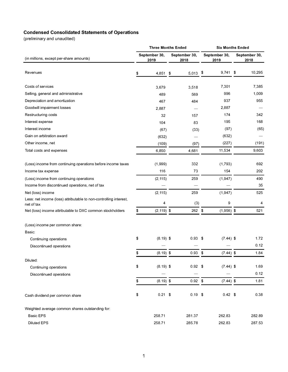 All statements in this press release that do not directly and exclusively relate to historical facts constitute “forward-looking statements.” These statements represent current expectations and beliefs, and no assurance can be given that the results described in such statements will be achieved. Such statements are subject to numerous assumptions, risks, uncertainties and other factors that could cause actual results to differ materially from those described in such statements, many of which are outside of our control. For a written description of these factors, see the section titled “Risk Factors” in DXC's Annual Report on Form 10-K for the fiscal year ended March 31, 2019, and any updating information in subsequent SEC filings including DXC's upcoming Quarterly Report on Form 10-Q for the quarterly period ended September 30, 2019. No assurance can be given that any goal or plan set forth in any forward-looking statement can or will be achieved, and readers are cautioned not to place undue reliance on such statements which speak only as of the date they are made. We do not undertake any obligation to update or release any revisions to any forward-looking statement or to report any events or circumstances after the date of this press release or to reflect the occurrence of unanticipated events except as required by law.