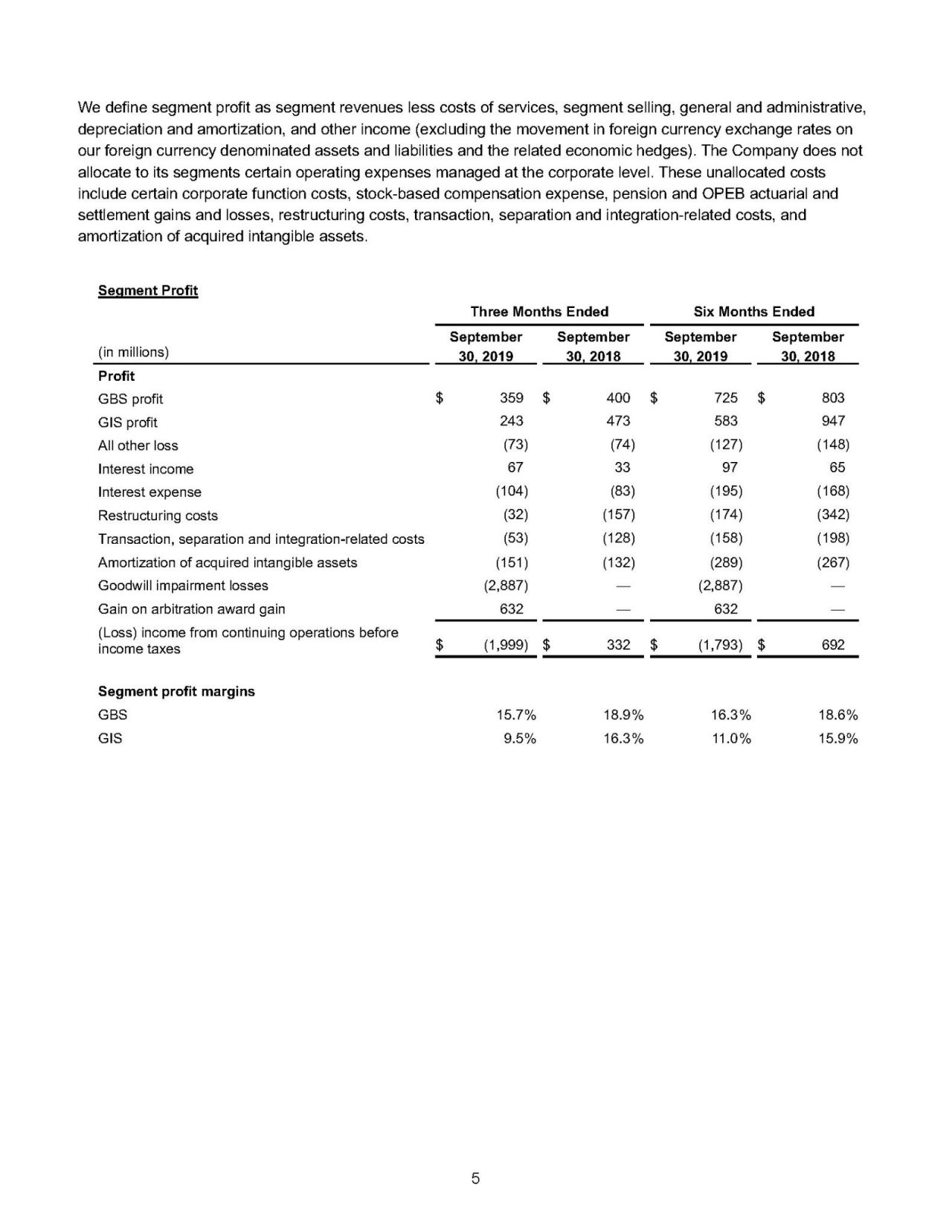 GBS revenue was $2,285 million in the quarter compared with $2,111 million for the prior year. GBS revenue increased 8.2% year-over-year, including an unfavorable foreign currency exchange rate impact of 2.3%. GBS revenues increased 10.5% year-over-year at constant currency reflecting contribution from acquisitions, including Luxoft. GBS profit margin in the quarter was 15.7%, compared with 18.9% in the prior year, reflecting investments to support Digital hiring and capabilities. New business awards for GBS were $1.9 billion in the second quarter.