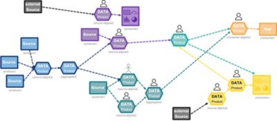 Data flows from sources (producers) through aligned data products (source-aligned, aggregated and consumer-aligned) to consumers, like apps or dashboards. This mesh-like structure connects silos, enabling scalable analytics and AI applications. Companies like AWS, IBM and Snowflake have adopted variations, emphasizing how Data Mesh solves security challenges through distributed ownership.